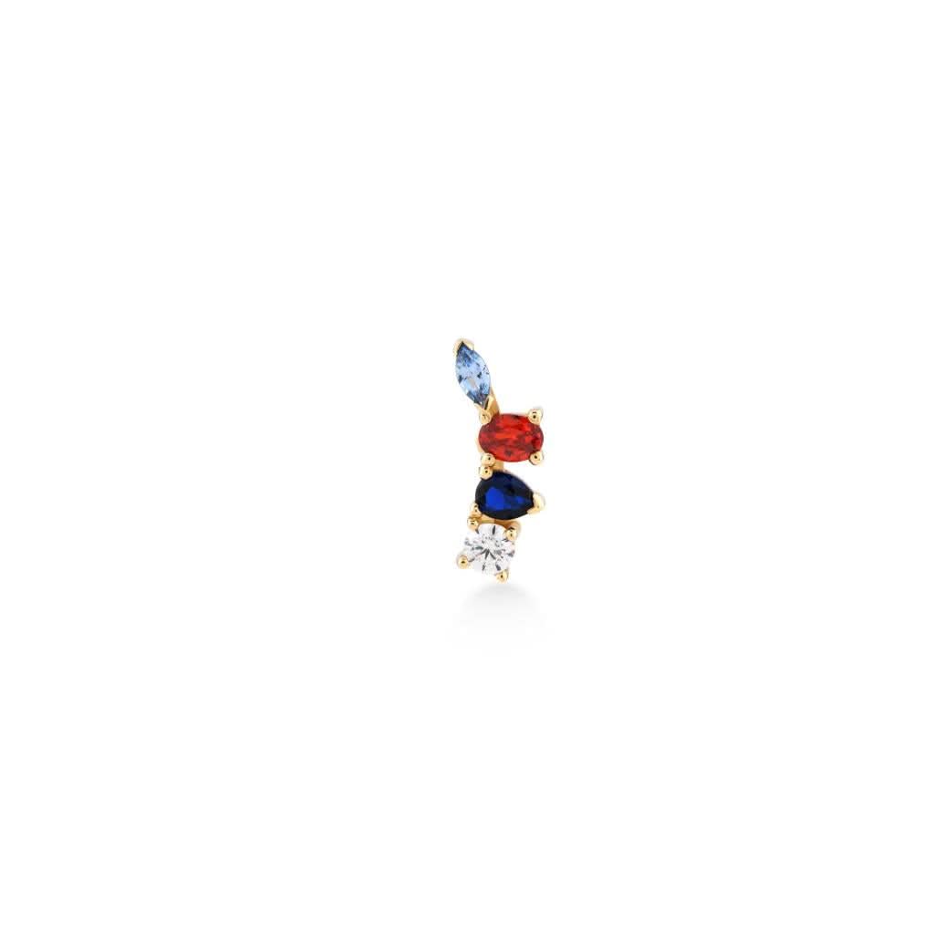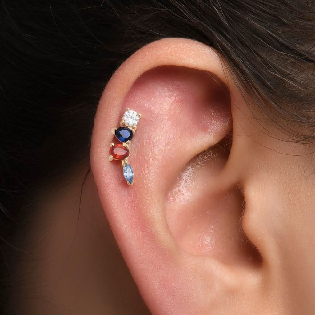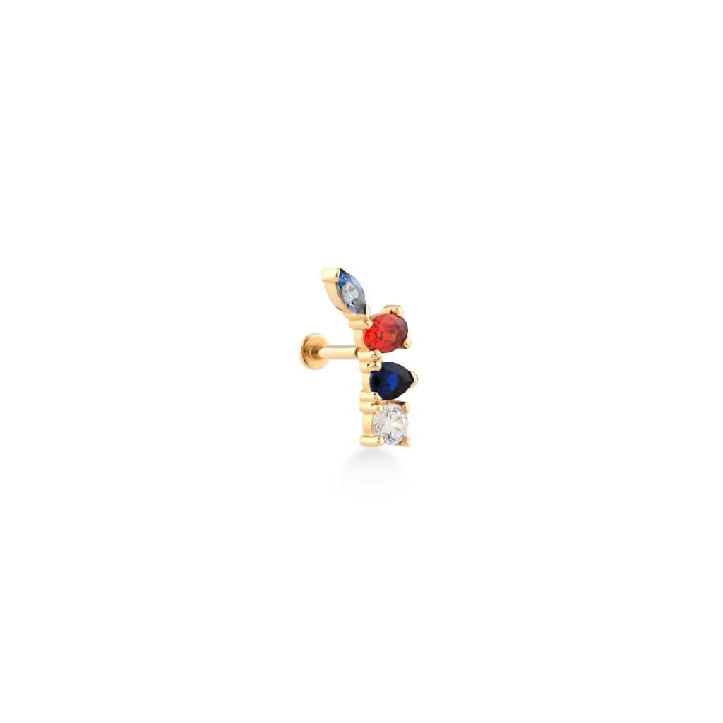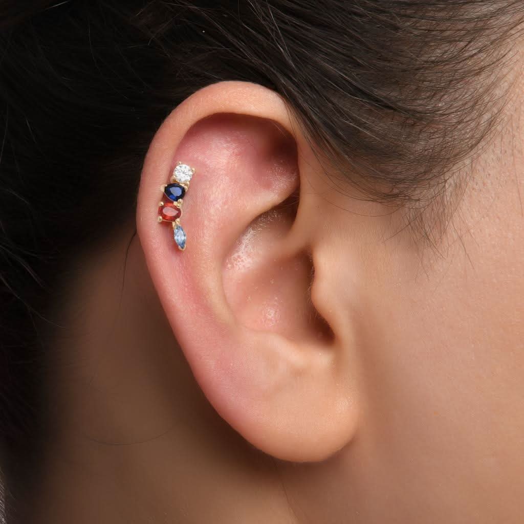 14 ayar altın renkli farklı kesim taşlı piercing, sağ kulak için özel olarak tasarlanmış eşsiz bir aksesuardır. Farklı kesimlerdeki renkli taşlar, modern ve göz alıcı bir görünüm sunarak kulakta zarif bir ışıltı yaratır. Günlük stilinize hareket katar ve özel günlerde şıklığınızı tamamlar. Kendinizi özel hissetmenizi sağlayacak bu tasarım, sofistike ve iddialı bir duruş sergiler.