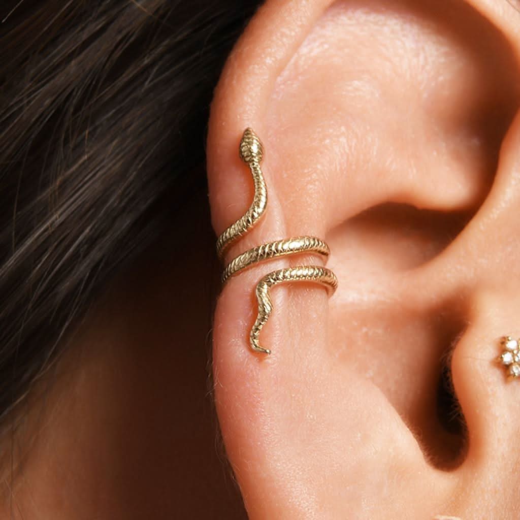 Gizemli ve güçlü bir duruş sergileyen 14 ayar altın Sarmal Yılan Altın Kıkırdak Earcuff Piercing, zarafeti ve cesareti bir araya getiriyor. Yılan figürü, dönüşümü ve gücü simgelerken, spiral tasarımı kulağınıza modern ve sofistike bir hava katıyor. Küpe deliği gerektirmeyen bu earcuff, günlük stilinizi tamamlamak için ideal bir seçim!